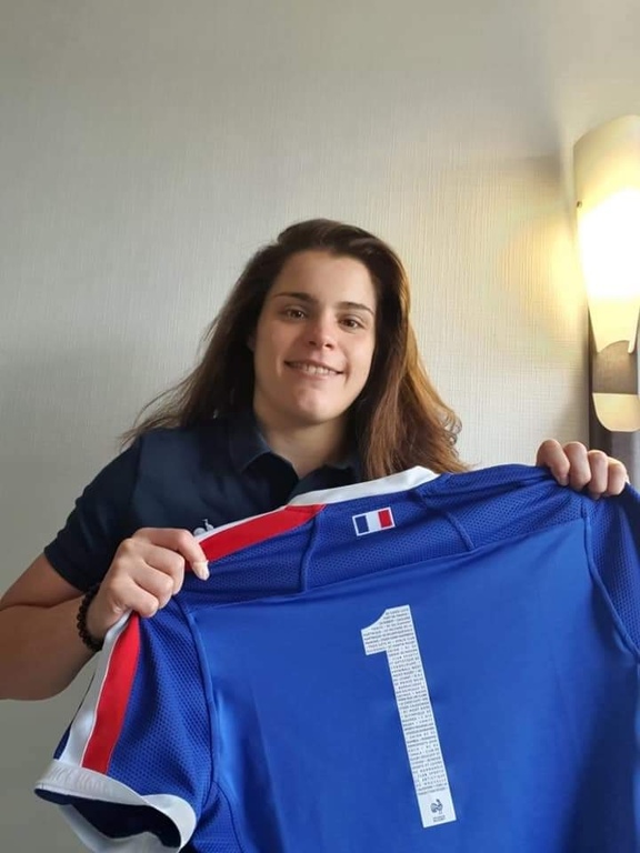 Annaëlle, offrant le maillot de l'Équipe de France Féminine floqué 14 au nom du RCY